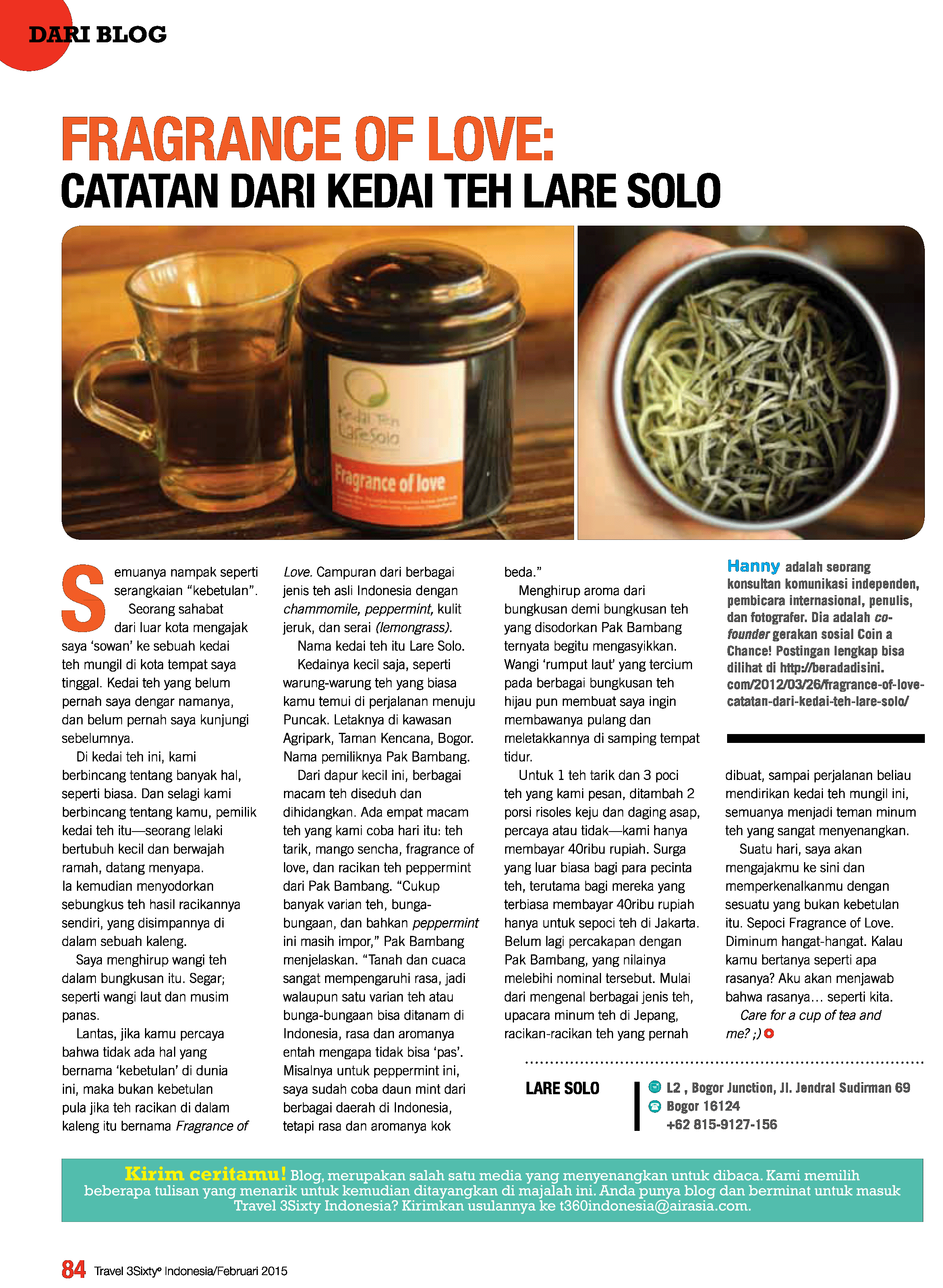 Lantas, jika kamu percaya bahwa tidak ada hal yang bernama ‘kebetulan’ di dunia ini, maka bukan kebetulan pula jika teh racikan di dalam kaleng itu bernama Fragrance of Love. Campuran dari berbagai jenis teh asli Indonesia dengan chammomile, peppermint, kulit jeruk, dan serai (lemongrass).