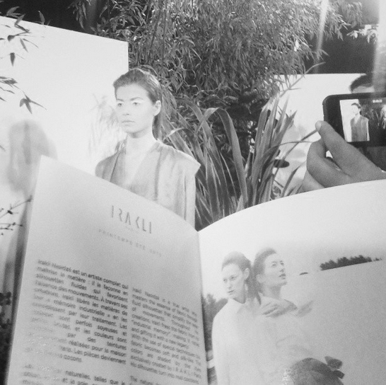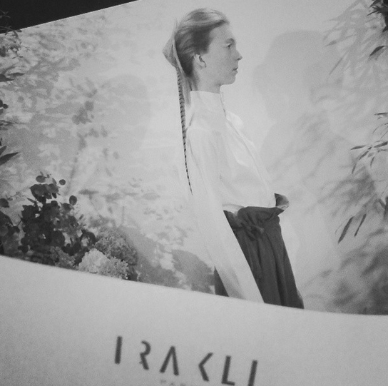 Malam itu, bersama para jurnalis fashion, fashion buyer dari rumah-rumah mode dan toko-toko retail ternama dari seluruh dunia, serta para penikmat fashion di Paris, saya mengagumi koleksi Irakli yang nampak segar, bersih, dan indah–dipresentasikan di ruangan yang berlatar putih dan dipadati dedaunan dan bebungaan. Cantik sekali dipadankan dengan warna-warna desainnya: biru, hijau, dan kuning.