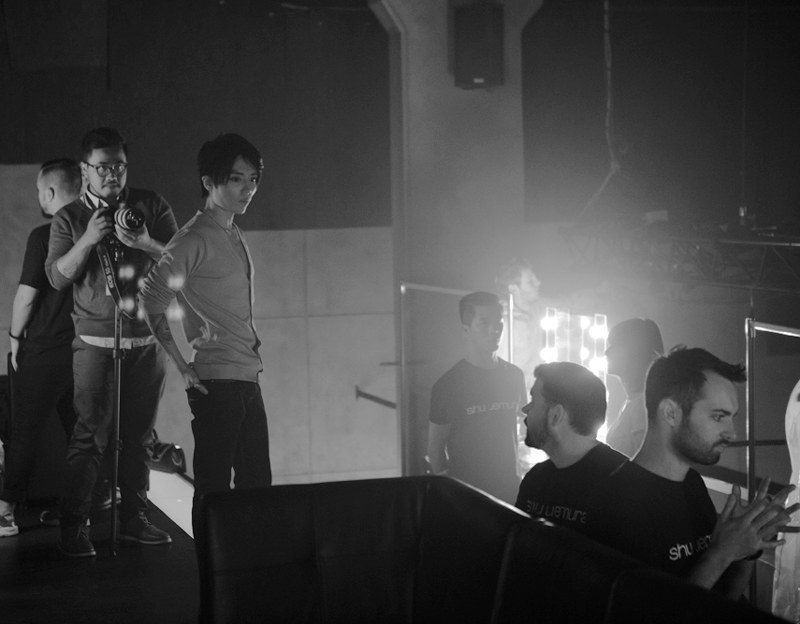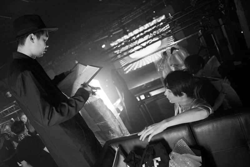 Seorang model berjalan melewati saya dengan terburu-buru, sambil mengunyah sesuatu. Ia sudah berganti pakaian; mengenakan jeans, kaus lengan panjang, dan scarf yang melilit leher–namun make-up dan tatanan rambutnya yang spektakuler nampaknya belum sempat disingkirkan.